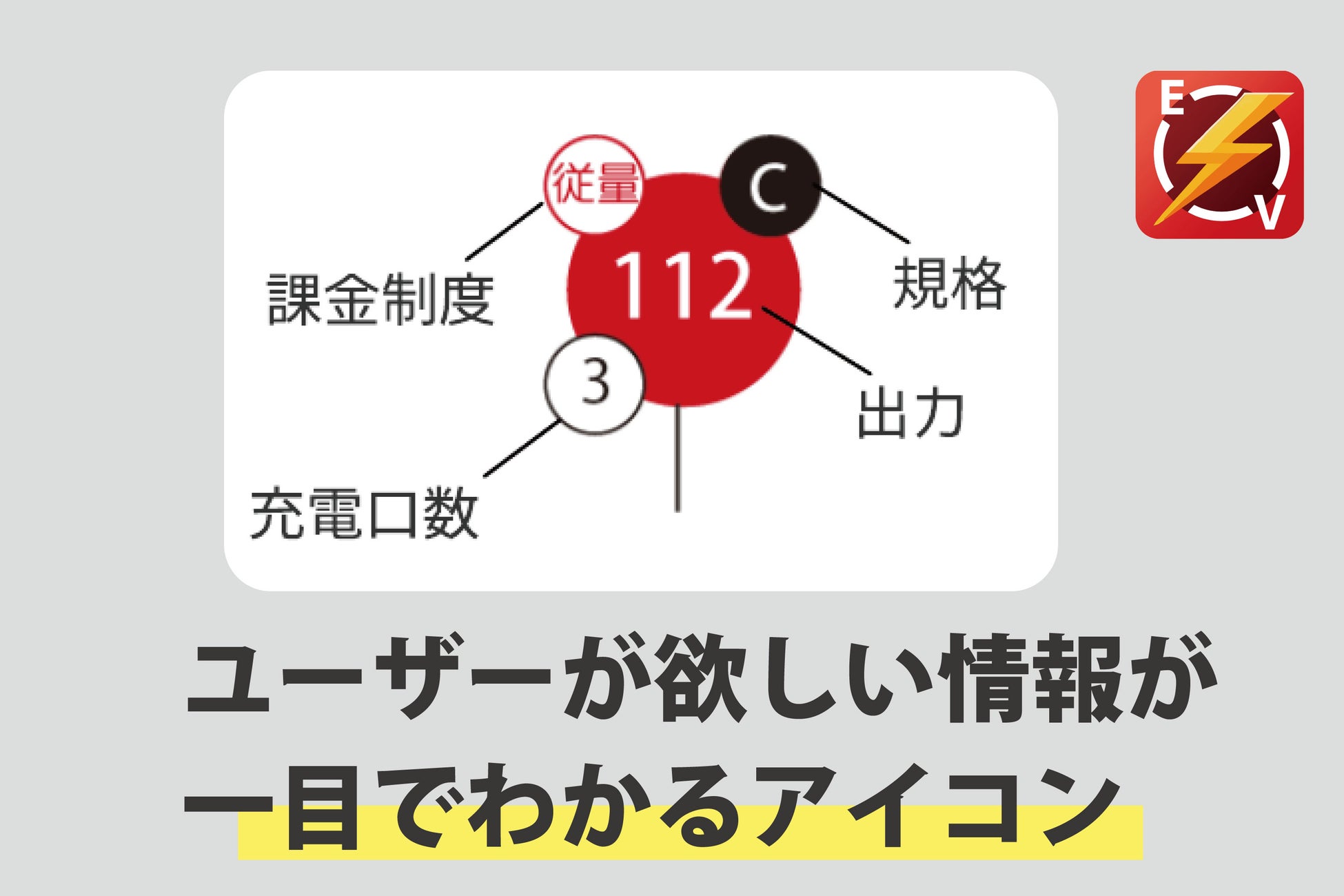 充電スポットの位置を示すピンは、完全オリジナル仕様です。EVドライバーが本当に求める、「高い充電出力」「使用プラグタイプ」「充電口数」「充電料金の課金方式」の情報が一目で分かるようになっています。