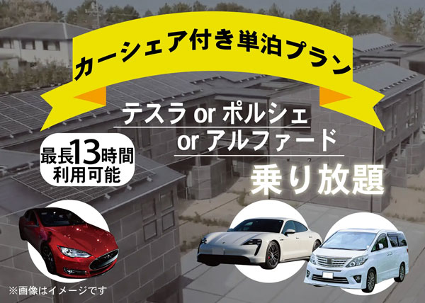 11月末までの期間限定で、「テスラ」「ポルシェ」「アルファード」が1日中自由に利用できる「カーシェア付き単泊プラン」。運転免許があれば誰でもご利用いただけます。
